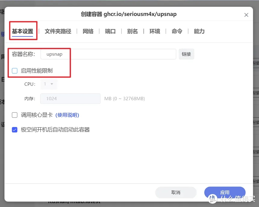 🔺【基本设置】这里,容器名称自己可以随意修改,可以取消勾选“启用性能限制”。