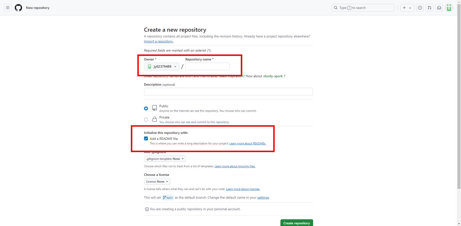 这里上面的红框给我们的仓库取个英文名字,下红框勾选Add a README file,然后点击最下绿色按钮进下一步。这样,我们的仓库就建好了。
