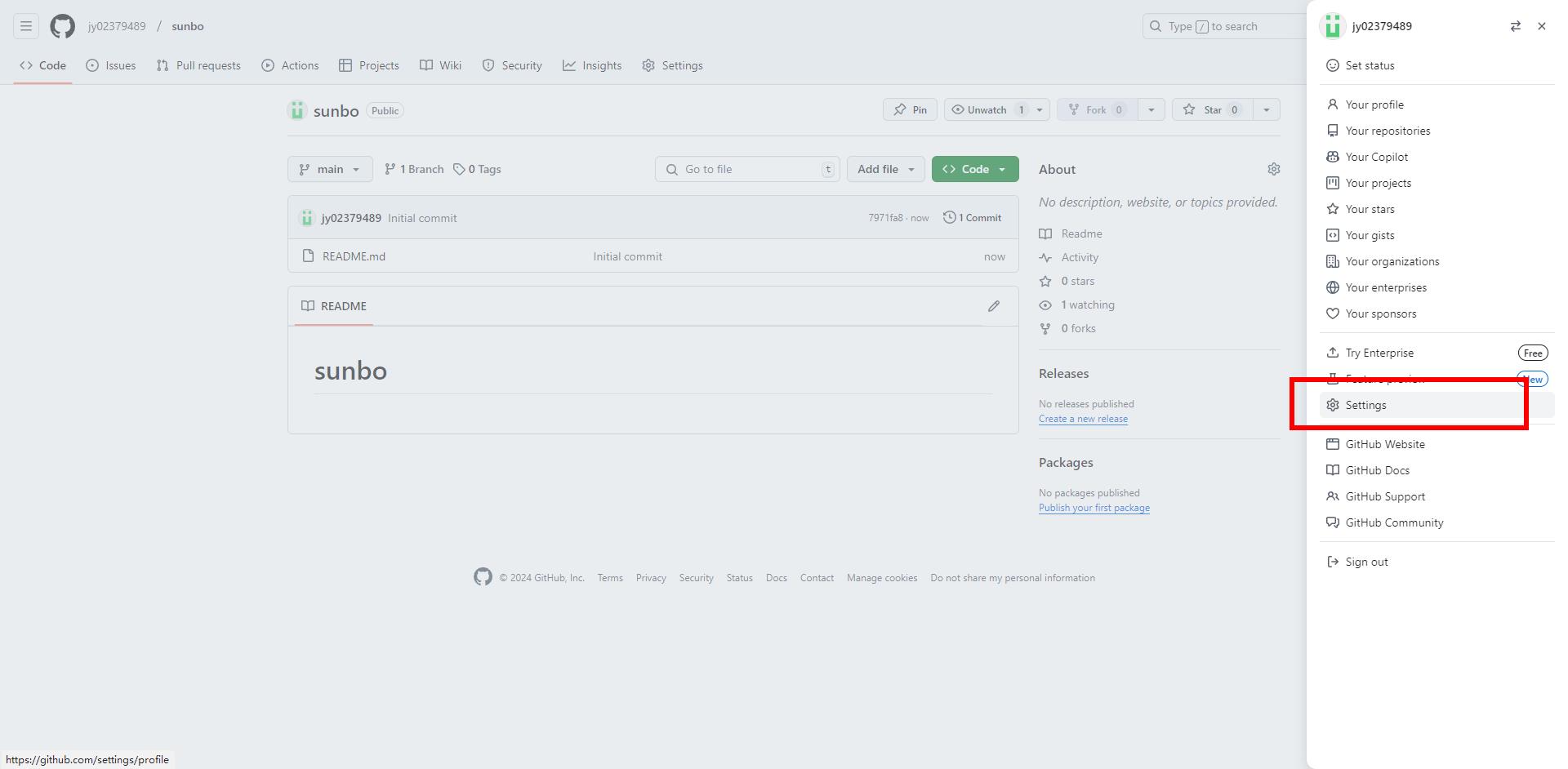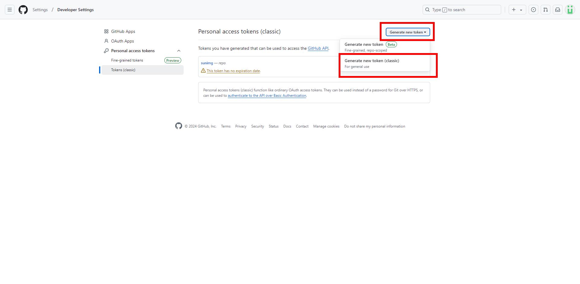 接下来我们点击右上角自己的头像,在弹出的界面找到设置按钮Settings,在下一个页面最左下方找到并点击进入<>Developer settings,进入下一页面后依然是左边最下面的Personal access tokens的Tokens(classic)