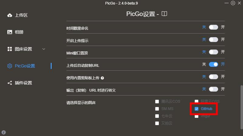 打开软件后进入PicGO设置,拉到最下面把GitHub以外的勾取消
