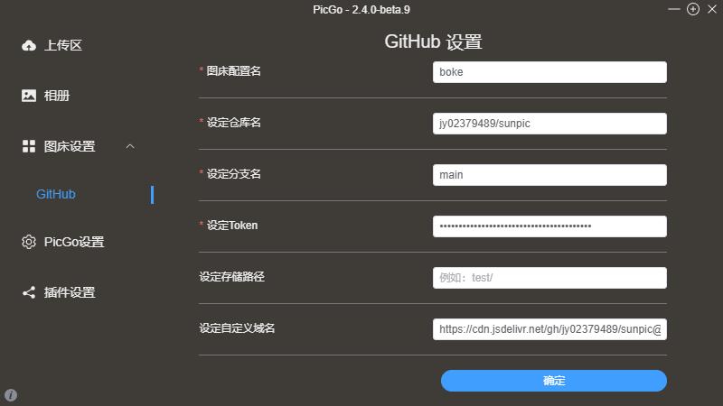※ 设定自定义域名:https://cdn.jsdelivr.net/gh/[github用户名]/[仓库名]@master,注意,此处的分支一定要填写@master,如果不指定,则会出现图片不能上传的情况。